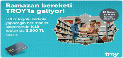 Ramazan Bereketi TROY’la geliyor! TROY logolu kartınla 22 Mart’a kadar gıda marketlerinde yapacağın tüm market alışverişlerinde %10, toplamda ise 2.000 TL nakit iade fırsatı seni b...