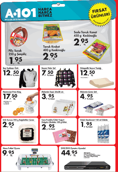 A 101 Marketlerinde her hafta tüketiciye daha ucuz ve indirimli fiyatlar ile sunulan fırsat ürünleri büyük ilgi görüyor. 9 Aralık 2010 Perşembe gününden itibaren A 101 marketlerin satışa sunulacak fırsat ürünleri: